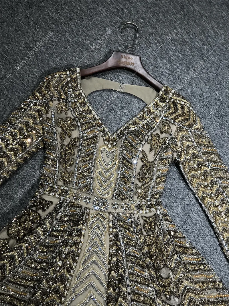 Special Offer 2020 Mais Novo De Alta Qualidade Luxuoso Cor Do Ouro Pesado Beadings A Linha Com Decote Em V Mangas Compridas Formatura Festa Vestidos Noite Discount 0% Today!