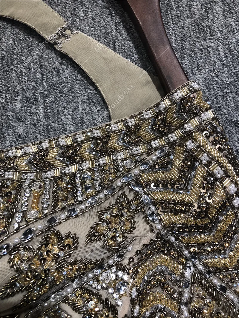 - 1199.00 . (0% Off) Melhor 2020 Mais Novo De Alta Qualidade Luxuoso Cor Do Ouro Pesado Beadings A Linha Com Decote Em V Mangas Compridas Formatura Festa Vestidos Noite Barato Online Preço.