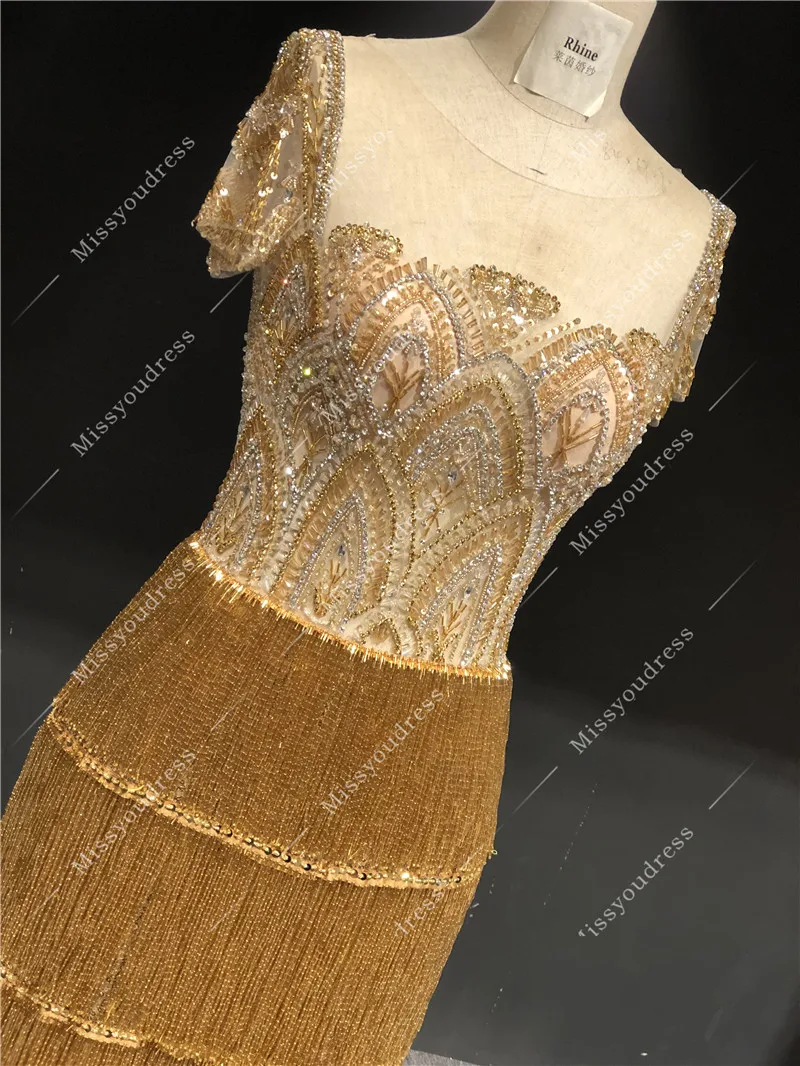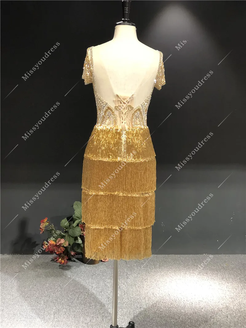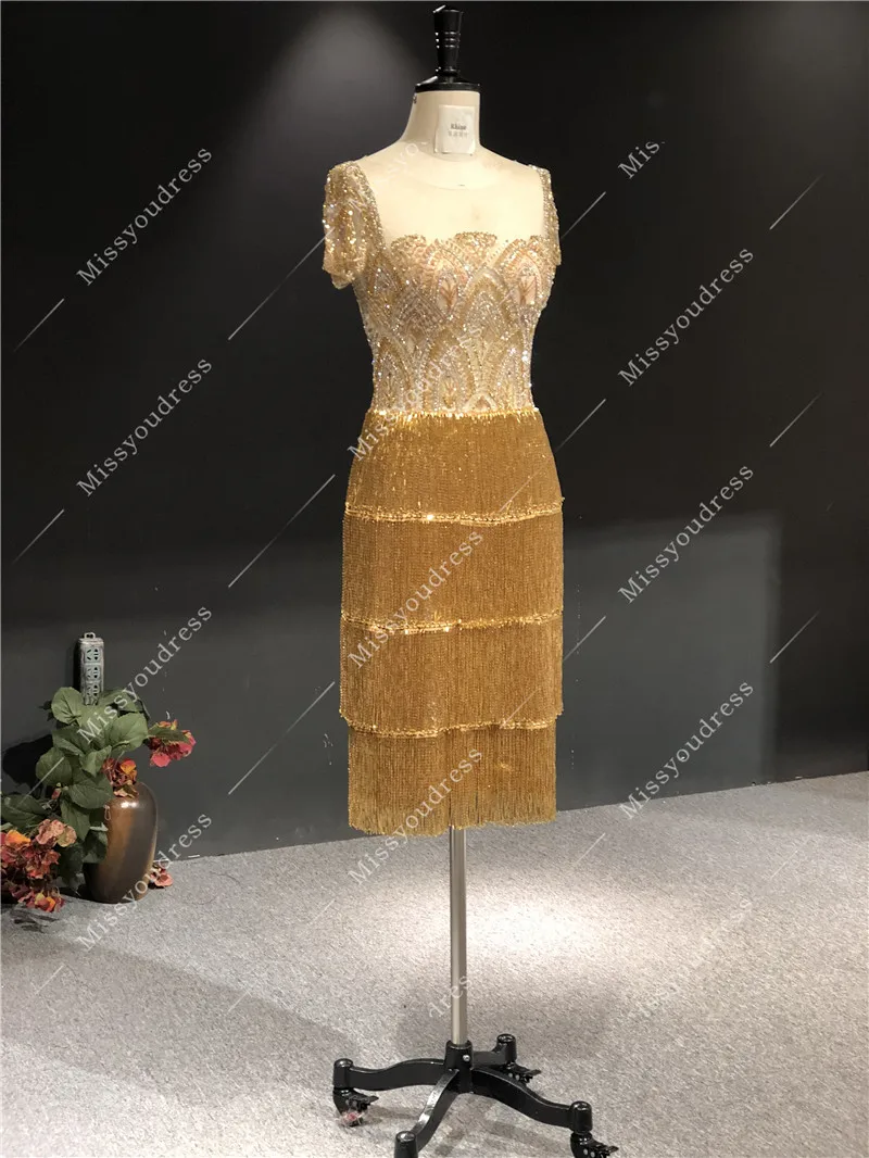 Special Offer 2020 Mais Novo De Alta Qualidade De Luxo Ouro Borla Pesado Beadings Quadrado-pescoço Mangas Curtas Festa à Noite Vestido Discount 0% Today!